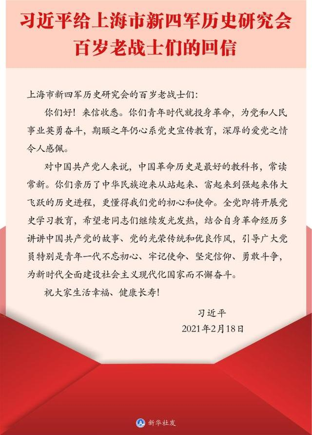 习近平总书记2月18日给上海市新四军历史研究会的百岁老战士们回信,强调多讲讲党的故事光荣传统和优良作风,更希望“引导广大党员特别是青年一代不忘初心、牢记使命、坚定信仰、勇敢斗争,为新时代全面建设社会主义现代化国家而不懈奋斗”。