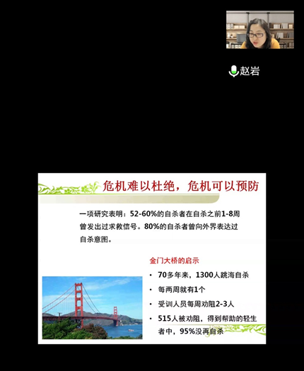 最后,赵岩强调,作为班级心理委员,发现这类心理危机事件不要慌张,首先应做到及时向辅导员、心理中心等相关部门报告,语言要做到简介明了。并给予危机学生关心、帮助,支持和理解,但需谨慎承诺,以防危机事件的发生。