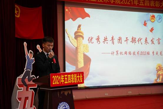 大唐信息技术学院计算机网络技术203班优秀共青团干部代表李成龙表示作为团学干部,要厚植党史学习教育,为中华民族谋复兴助力;要学史明理、学史增信、学史崇德、学史力行;要坚定理想信念,牢记初心使命,勇于自我革命,为新时代新征程保驾护航。