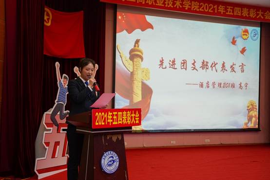 餐旅服务学院酒店管理201班先进团支部代表高宇介绍了支部建设工作和心得体会。各团支部围绕党史开展各类主题团日活动,包括:党史学习、红诗朗诵、建党百年主题演讲、观看《觉醒年代》红色影片、外出学习参观等,团员们学习热情高涨,积极参与。团员们还积极加入到学校大学生党史宣讲团、参与康华敬老院活动、清理学校附近河道工作等,通过学习大家深刻得感受到现在生活和幸福来之不易,广大青年要珍惜如今,奋发图强。