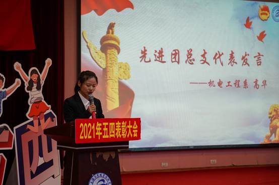机电工程系的先进团总支代表高华从五个方面介绍共青团工作:培养五种意识,稳抓思想建设;紧握四个抓手,加强组织建设;狠抓专业竞赛,关注国家痛点问题,带领学生开展社会实践活动;锻炼学生文创能力,注重传统元素的时尚表达;厚植党的理论,谋特色亮点,开展多彩的活动。