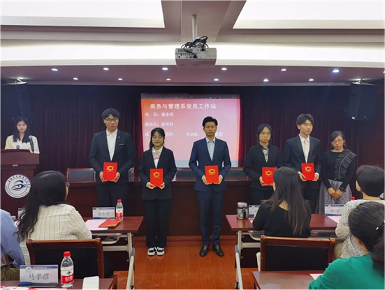 随后,商务与管理系党支部书记马孝彦为商管系党员工作站成员们颁发聘书。