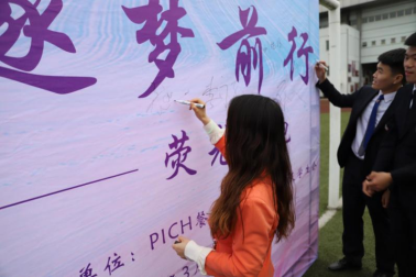 仪式最后,阳宏图同学唱响歌曲《奔跑》,有的同学打起了节奏、有的同学挥起了双手、有的同学鼓起了掌,在荧光手环和同学们的合唱下,整个现场变得更加热闹,老师和同学们纷纷在展板上签名留念。