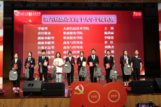感动工商十大学子励志型获得者机电工程系谭昀洋表示:作为新时代大学生,是实现第一个百年奋斗目标的见证者,也是实现第二个百年奋斗目标的建设者,必须要勇担时代重任,以奋斗之我致青春。勤工助学优秀个人代表餐旅服务学院张俊表示:他将继续发扬志愿服务精神,把自己的青春融入到为祖国、为人民服务的社会实践中去。作为新时代大学生当以强我中华为己任,为党的壮大发展,为祖国的繁荣昌盛而不懈努力,做新时代的优秀大学生。