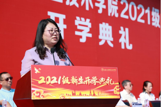 基础部党支部书记、副主任李小玲作为教师代表发言。她欢迎21级新同学来到工商的校园里,勉励同学们要学会学习、学会做事、学会做人。为努力成为“理想素养有境界,知识技能有特点,创新创业有实践,终身发展有潜力”的四有人才而不懈努力。