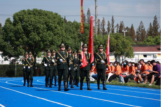 伴随着激昂的乐曲声,国旗班迈着铿锵有力的步伐,昂首阔步护卫国旗走向升旗台,数千名师生整齐列队行注目礼。庄严的升旗仪式后,开学典礼正式开始。