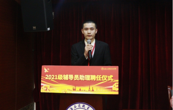 第三项议程,由来自汽车工程系的王啸宇代表全体2021级辅导员助理发言,他表示会明确角色定位,增强自身责任感和使命感,协助辅导员做好班级管理工作、抓好班风学风建设,以身作则树立榜样,成为辅导员老师的得力助手和新生的知心朋友。