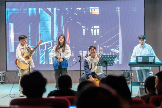 我们是野草,不怕挫折,肆意追梦;愿你年年似今朝,高歌梦想与爱。大唐信息技术学院管正涵、张佳豪、王天鸿、教育学院张洋妮带来的校园原创歌曲《旧单车》,向在场的观众们展现诗情画意的青春记忆。
