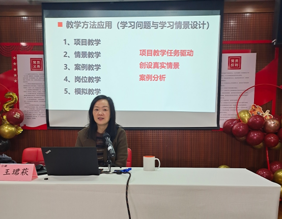 最后一场针对教师教学能力大赛的讲座旨在向老师们解析当前教学能力大赛的导向和具体要求,王老师通过比赛要求,从教学设计、课堂教学、评价目标和反思改进四个方面,针对参赛作品材料给出了具体的指导意见。随后,她又结合我们学院的专业选取了3个代表性的教学能力国赛作品,对教学实施报告做了详细指导,并对“岗课赛证”的逻辑和方法进行了充分讲解。