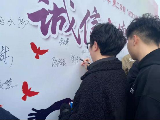 最后,各院系学生代表积极踊跃地在“诚信立德”百日行动启动仪式的签名墙上签名,纷纷表示:在日常生活中会自觉践行社会主义核心价值观,努力提升自身素养,积极践行使命担当。积极参加各项活动,让诚信的种子在心中生根、发芽,真正做到“诚信立德,尚学笃行”。