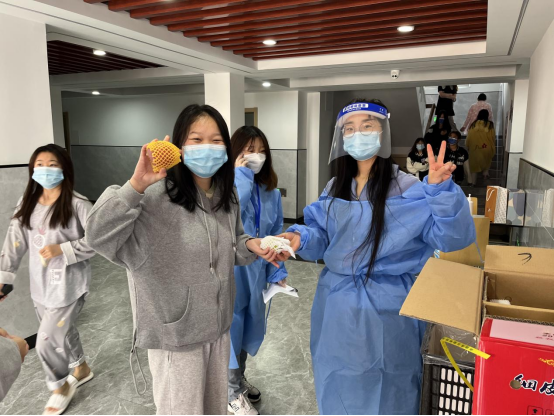 水果经过消杀、静置,再由各楼宇楼长、副楼长、学生楼层长和学生志愿者上门分发。“学校给我们送苹果、香梨,我非常感激和感动,谢谢学校,抗疫加油!”“苹果好甜,谢谢学校!志愿者们也辛苦了!”“有时候生活中的小确幸并不需要十分的奢侈,一个苹果也可以带来许多温暖。希望上海尽快战胜疫情,希望每一个人一切安好。” 工商学子收到了学校的“爱心投喂”,幸福又感恩。接收这份礼物后,许多学生为之动容,在朋友圈表达对学校的感谢和抗疫的信心。