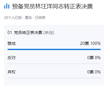 林汪洋同志表态后,会议采取线上无记名投票进行表决,其中20名党员有表决权,经表决,支部党员全票同意林汪洋同志如期转正。陈旭宣读支部大会关于通过林汪洋同志转正申请的决议,大会认为林汪洋同志已经具备中共正式党员的条件,同意其按期转正。