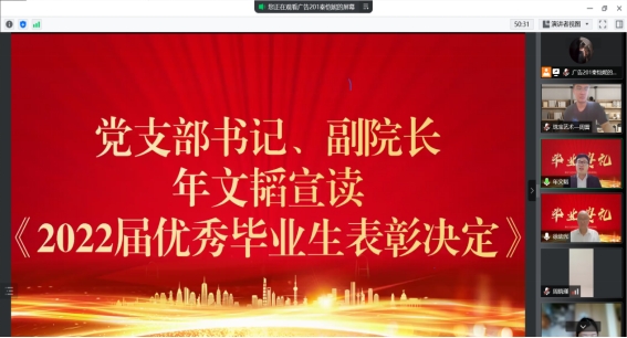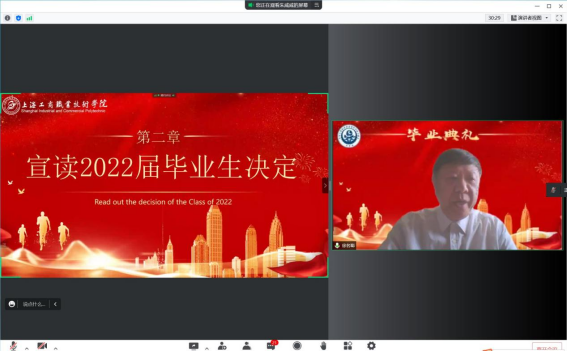 大唐信息技术学院院长俞蝶琼、教育学院院长黎莉、珠宝与艺术设计学院院长徐幼光、PICH现代服务学院直属党支部书记朱燕、商务与管理系副主任曹芸、机电工程系主任徐名聪、汽车工程系主任黄虎宣读了各院系2022届毕业生名单;大唐信息技术学院党支部书记王丽茹、教育学院院长黎莉、珠宝与艺术设计学院党支部书记年文韬、PICH现代服务学院执行院长唐威、商务与管理系党支部书记陈其、机电工程系党支部书记马孝彦、汽车工程系党支部书记丁敏宣读各院系2022届优秀毕业生名单。共有73名同学荣获上海市优秀毕业生荣誉称号、241名同学荣获kaiyun开云官方在线入口优秀毕业生荣誉称。