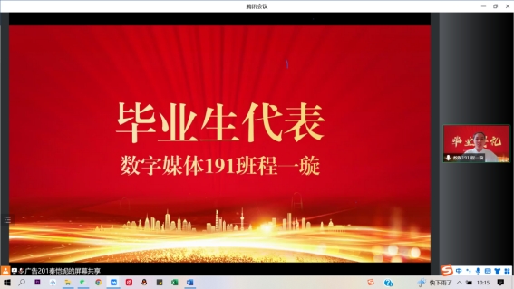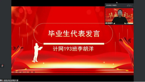计网193班李胡洋、应英191班吴佳宝、数媒191班程一璇、旅游191班施倩丽、会计193班朱一丹、机制191班屠禾汐、新能源192班李新宇作为各院系毕业生代表发言。各位毕业生纷纷谈到大学校园带给他们的不仅是专业知识上的提升,更是能力的增强和视野的开拓。感谢母校为同学们创造的良好的学习环境以及丰富的校园生活,感谢各位老师的谆谆教导和悉心关怀,毕业生们将心怀感恩之心和乐于奉献之情继续拼搏,将所学本领应用于实践,为母校争光。