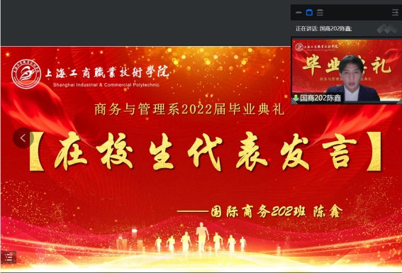 计网202班的帕力扎提·帕尔哈提、国际商务202班陈鑫、机电201班王帅作为在校生代表向2022届顺利完成学业的学长学姐们表示祝贺,并祝愿毕业生们,乘风破浪、挥斥方遒,书写新的华彩篇章。