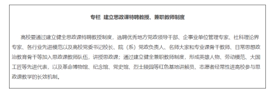 14.建设专兼结合的师资队伍。各地各校严格按照要求配备建强高校专职思政课教师、辅导员队伍,提高中小学专职思政课教师比例,实行思政课特聘教授、兼职教师制度,积极聘请党政领导、科学家、老同志、先进模范等担任思政课兼职教师。深入实施马克思主义学院院长(书记)培养工程,通过集中培养培训、委托重大项目、加强实践锻炼、开展国际国内访学等方式,培养一批青年马克思主义理论家。