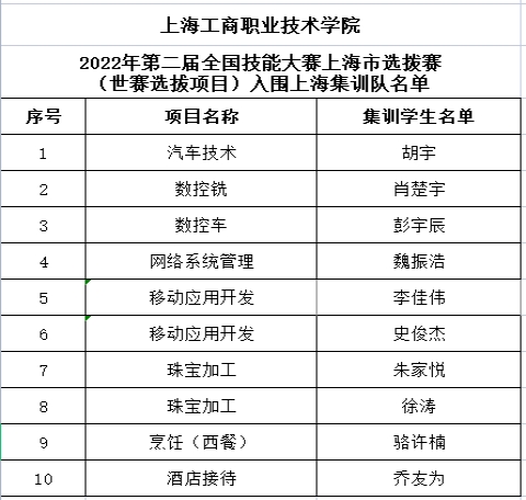 近日,上海市人力资源和社会保障局联合上海市教育委员会等多部门颁发《关于表扬第二届全国技能大赛上海市选拨赛(世赛选拔项目)获奖选手和为参赛工作作出突出贡献的个人及单位的决定》(沪人设职[2022]338号)和《上海市人力资源和社会保障局关于组建第二届全国技能大赛飞机维修等63个世赛选拔项目上海集训队的通知》(沪人设职[2022]352号),我校共21名师生获表彰。其中学生李佳伟、骆许楠分别获得移动应用开发项目、烹饪(西餐)项目银牌;胡宇、肖楚宇、魏振浩等17名学生在汽车技术项目、数控铣项目、网络系统管理项目等11个项目中获得优胜奖。俞蝶琼老师和张辰予老师分别获得移动应用开发项目和烹饪(西餐)项目“优秀指导教练”奖。汽车技术、数控铣、移动应用开发 、珠宝加工、烹饪(西餐)等8个项目10名学生入围上海市集训队。