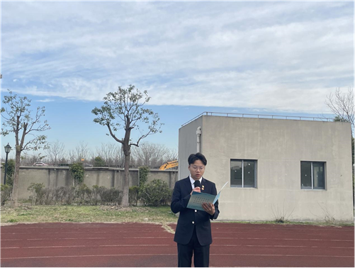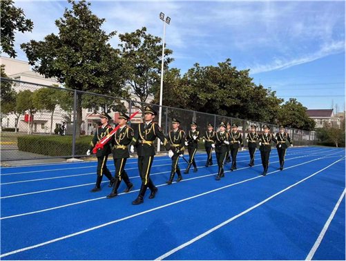 7点45分,国旗队的旗手们着装整齐,迈着矫健的步伐,护着鲜艳的五星红旗入场进行升旗仪式。伴着《义勇军进行曲》的响起,全体唱国歌、行注目礼,庄严肃穆。
