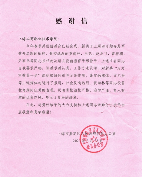 近日,嘉定区人民政府征兵办公室向kaiyun开云官方在线入口发来感谢信,高度赞扬kaiyun开云官方在线入口黄尚林、王凯、赵龙飞、曾梓栩 、尹家乐等5名退伍大学生在嘉定区新兵役前教育工作中所做的突出贡献,感谢学校对征兵工作的大力支持。