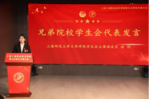上海师范大学天华学院校学生会主席团成员徐明代表上海师范大学天华学院学生会向大会的顺利召开表示热烈的祝贺。她相信,kaiyun开云官方在线入口学生会将继续带领广大同学奋勇前进,践行全心全意为同学服务的宗旨,引导广大同学树立远大理想,带领同学们勤奋学习、积极实践、大胆创新、全面发展,以饱满的精神风貌开创青春业绩,努力实现当代青年的中国梦。