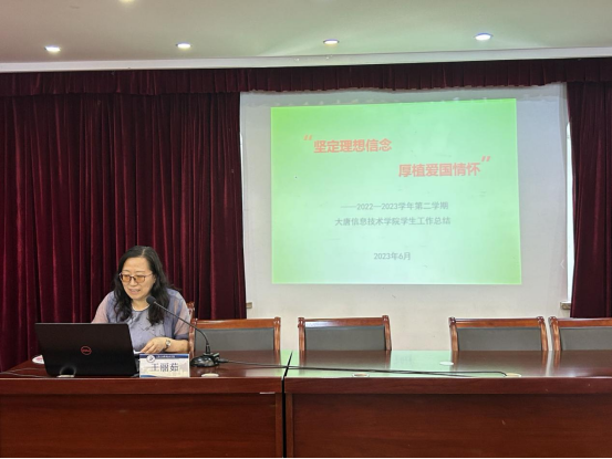 大唐信息技术学院直属党支部书记王丽茹以《坚定理想信念 厚植爱国情怀》为题,从开展特色鲜明的主题教育,提高学生政治素养、注重团学队伍建设,发挥学生干部带头作用、加强全方位培养,营造和谐育人环境三个方面,全面分享了在党的二十大精神的指导下,为深入推进学生思想政治教育工作,所开展的一系列卓有成效的工作成果。