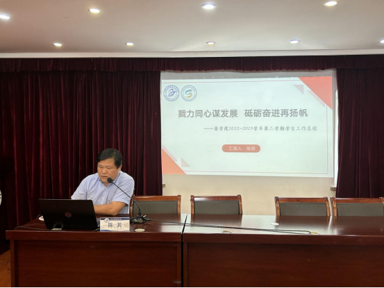 商学院直属党支部书记陈其以《勠力同心谋发展 砥砺奋进再扬帆》为题,从党建引领、抓好学生思想政治教育工作,夯实基础、抓好辅导员队伍建设工作,党建带团建、抓好学院团学工作,育人导向、抓好学生资助工作,学生为本、抓好学生心理健康教育工作,安全第一、抓好学生宿舍管理工作,保障民生、抓好毕业生就业工作等七个方面分享本学期的工作经验,并表示将继续扎实推进学生思想政治教育和日常管理工作,不断提高学生教育管理的实效性。