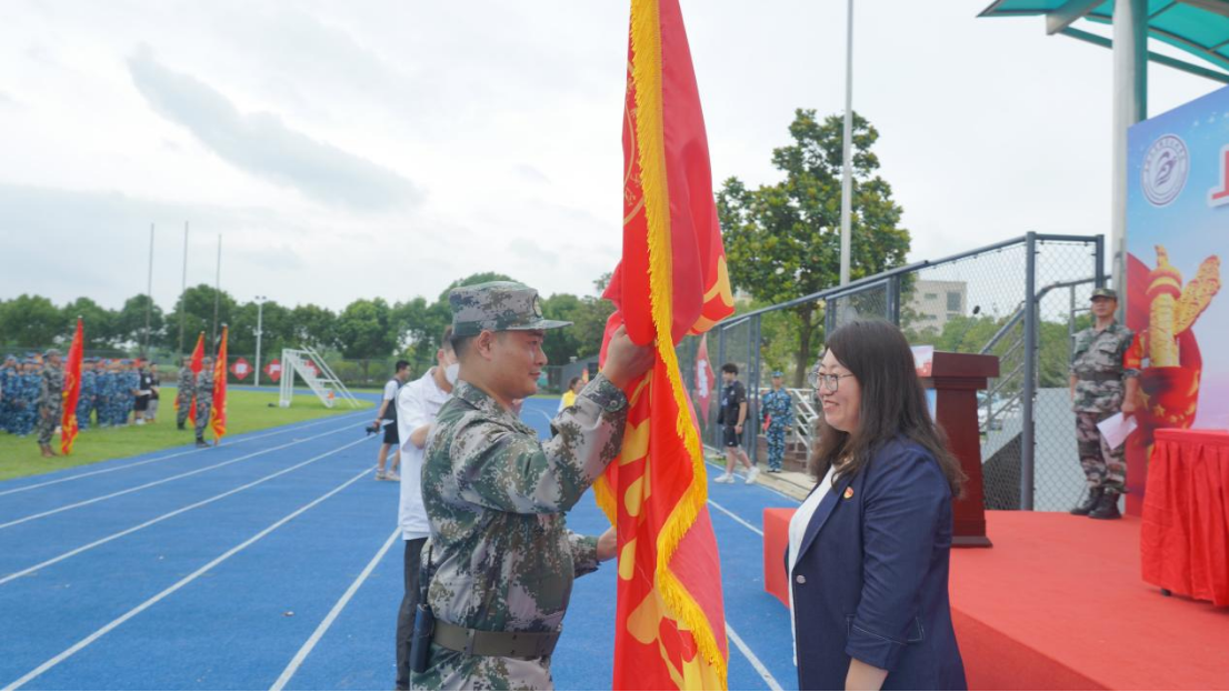 校党委副书记、副校长张中美为2022级军训团授旗,激励同学们严格要求、刻苦训练,以最饱满的精神面貌,展现青春的热烈与激昂。