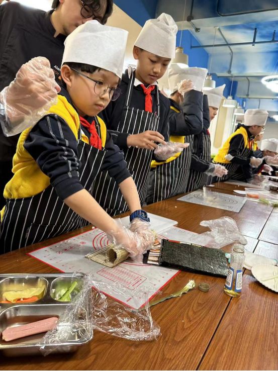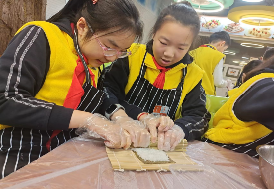 实操部分由餐饮专业老师带领学生完成。在认真观摩了老师的教学演示后,学生组内分工合作、互帮互助,完成剩饭变形。同学们热情高涨、纷纷动手,将平常无奇的剩饭变成美味可口的寿司、样式各异的饭团,每一个作品都凝聚着他们的劳动。课程最后,同学们在老师的带领下合作整理餐桌、洗餐盘、整理围裙等,分工有序,井井有条。这不仅锻炼了学生的劳动能力,也培养了团队协作能力。
