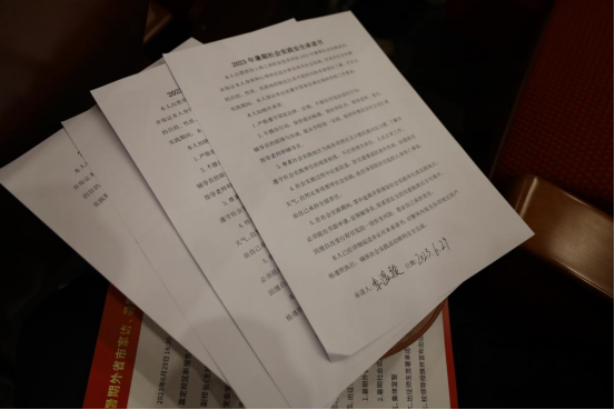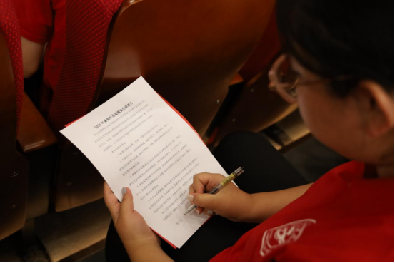 出征师生在领誓人陈宝胜的带领下集体宣誓,并签署承诺书。