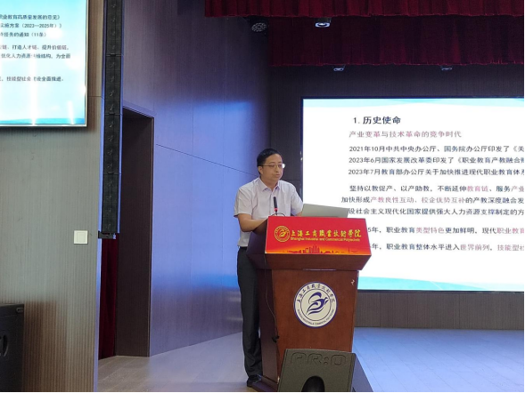 李向明以“守教育报国初心 担筑梦育人使命”为题,对全校教师提出三点要求。一是要有历史使命,我们处在一个产业变革与技术革命的竞争时代,作为新时代的教师,承担着教书育人神圣的历史使命和责任。我们要认真贯彻落实国家《职业教育产教融合赋能提升行动实施方案(2023—2025年)》和教育部办公厅关于加快推进现代职业教育体系建设改革重点任务的通知(11条)文件精神,坚持以教促产、以产助教,不断延伸教育链、服务产业链、支撑供应链、打造人才链、提升价值链;二是要有时代担当,坚持立德树人、德技并修,坚持产教融合、校企合作,坚持面向市场、促进就业,坚持面向实践、强化能力,坚持面向人人、因材施教;三是要有仁爱之心,要求全校教师在教育教学过程中尊重学生的人格,尊重学生的发展规律,让学生在获得尊重、信任的同时学会自我教育、自我完善。