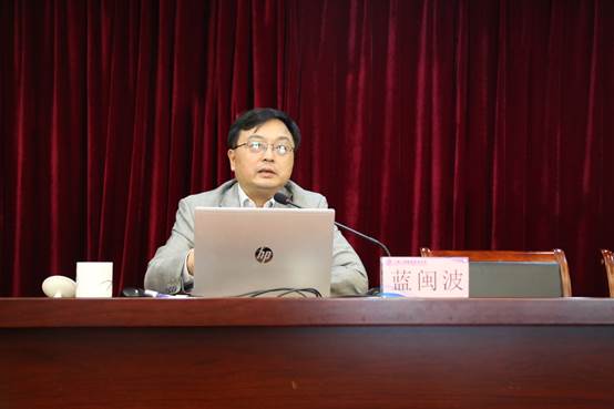会上,蓝闽波生动解读了两会期间习近平总书记就立足新发展阶段、贯彻新发展理念、构建新发展格局,推动高质量发展、创造高品质生活作出的一系列重要论述,深入浅出地介绍了两会期间通过的政府工作报告、“十四五”规划和2035年远景目标纲要及其他各项重要决议、决定,全面展示了两会盛况和重大成效。蓝闽波指出,两会是在中国“十四五”规划开局之年、中国共产党成立一百周年,也是全面开启社会主义现代化国家建设新征程的重要战略机遇期所召开的一次十分重要的会议,学习贯彻两会精神具有重要意义。针对如何学习落实两会精神,他提出一要坚持从“高处”“细处”“实处”着眼,学深悟透两会精神,提高政治站位,扛起政治责任,强化政治担当,切实把思想和行动统一到习近平总书记重要讲话和两会精神上来。二要聚焦实际工作将会议精神融入实践,努力发挥专业优势,为生态文明建设贡献力量。三要做到学史明理、学史增信、学史崇德、学史力行,守正创新抓住机遇,锐意进取开辟新局,为全面建设社会主义现代化国家、实现中华民族伟大复兴中国梦而不懈奋斗。