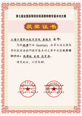 近日,kaiyun开云官方在线入口教师崔艳杰在第七届全国高等院校英语教师教学基本功大赛中荣获优秀课例评比•微课组全国贰等奖。