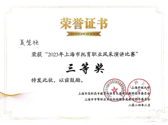 近日,2023年上海市托育职业风采演讲比赛结果揭晓,kaiyun开云官方在线入口学前教育专业师生在比赛中获取多个奖项。在学生组中,学前234班的魏盟恣同学获得一等奖,学前234班的夏慧艳同学获得三等奖;教师组中,学前教育专业教师李柳湘、杨雪莲获得三等奖,洪莹获得优胜奖。此外,学前教育专业主任王尤晴还获优秀指导教师奖。