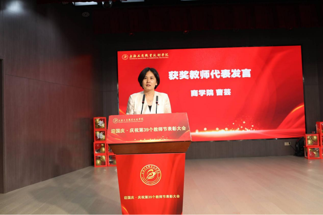 获奖教师代表商学院副院长曹芸分享了自己从教多年来的感受和体会,感谢学校多年来对她的悉心栽培。她号召全校教师在教师这个平凡而神圣的岗位上齐心协力,奋发进取,继续用行动见证理想,用耕耘换取芬芳,共同为工商教育事业更加美好的明天贡献智慧和力量。