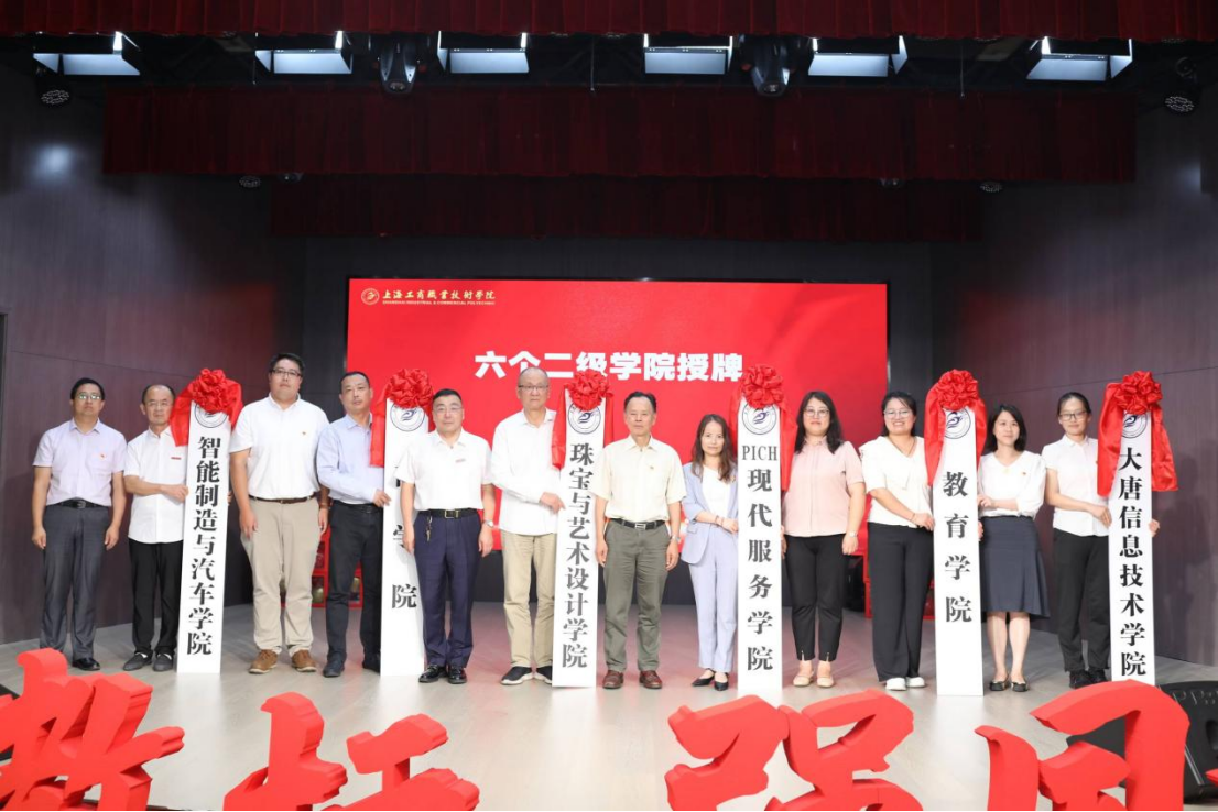 全体校领导为六个二级学院授牌。通过对院系相关学科建设、专业设置的全面梳理和科学论证,学校已经成立大唐信息技术学院、教育学院、PICH现代服务学院、珠宝与艺术设计学院、商学院、智能制造与汽车学院等6个专业二级学院。这是学校主动适应新时代、新战略,服务区域经济发展、产业转型的具体体现;是学校上层次、提水平、办特色的内在要求。6个专业二级学院的成立标志着学校进入了新的发展时期,在学校发展史上必将留下浓墨重彩的一笔。