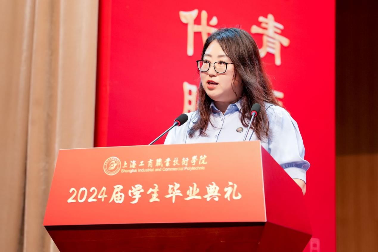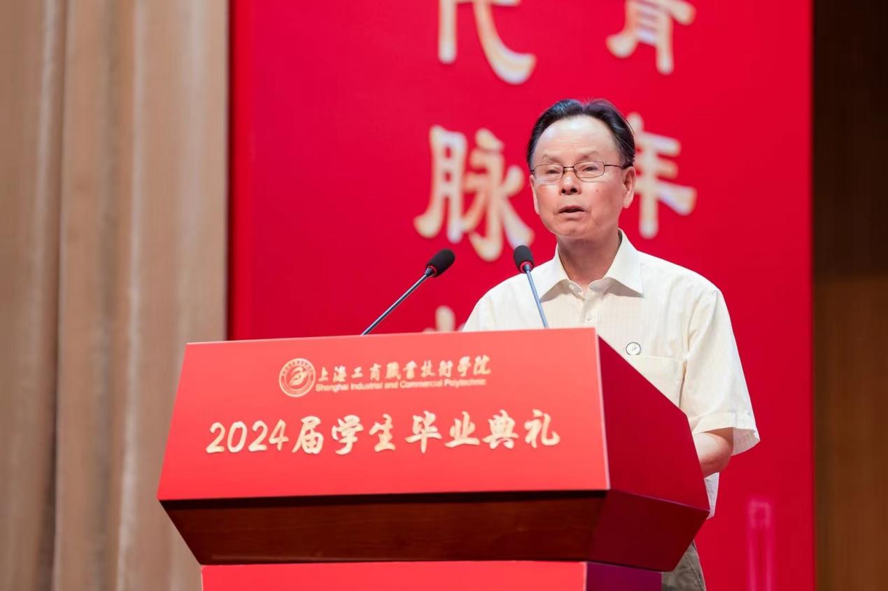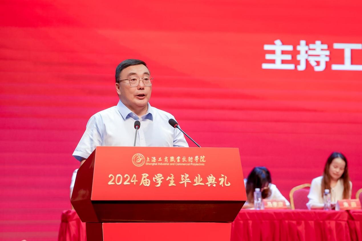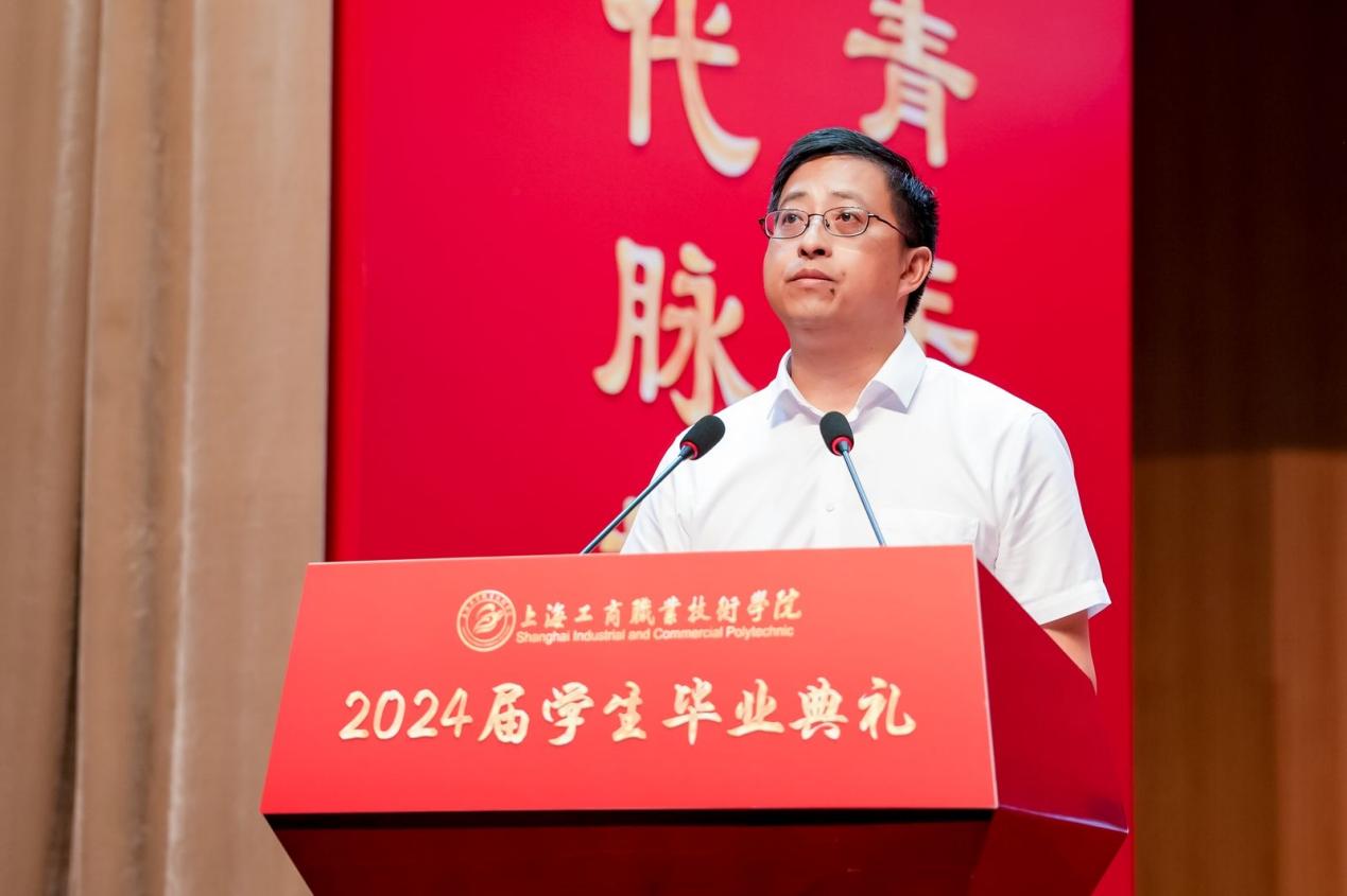 王中强向即将毕业的同学表达了真挚的祝福和殷切的希望。三年里寒来暑往,同学们匠心筑梦,为学校增添了独家记忆。同学们与工商的缘分始于一张录取通知书,成于一份毕业证书,书轻意重,纸短情长,其间辉映着工商薪火与同学们化茧成蝶的互动交融,承载着同学们敬业乐群、敢为人先的蜕变历程。同学们从刚进校时的懵懂青葱成长为独当一面的有志青年,在“挑战杯”、“汇创青春”、大学生数学建模大赛以及各项技能大赛的领奖台上大放异彩,用国家奖学金、上海市奖学金等奖项一次次刷新荣誉榜单,同学们心怀家国情怀,扎根基层一线,服务乡村振兴,把青春挥洒在祖国最需要的地方。用实际行动诠释了责任与使命,用青春汗水书写了无悔与担当。