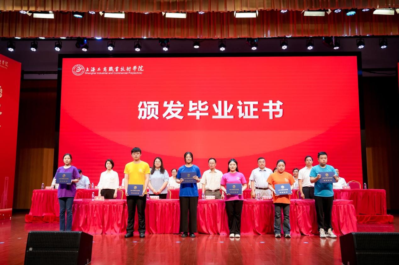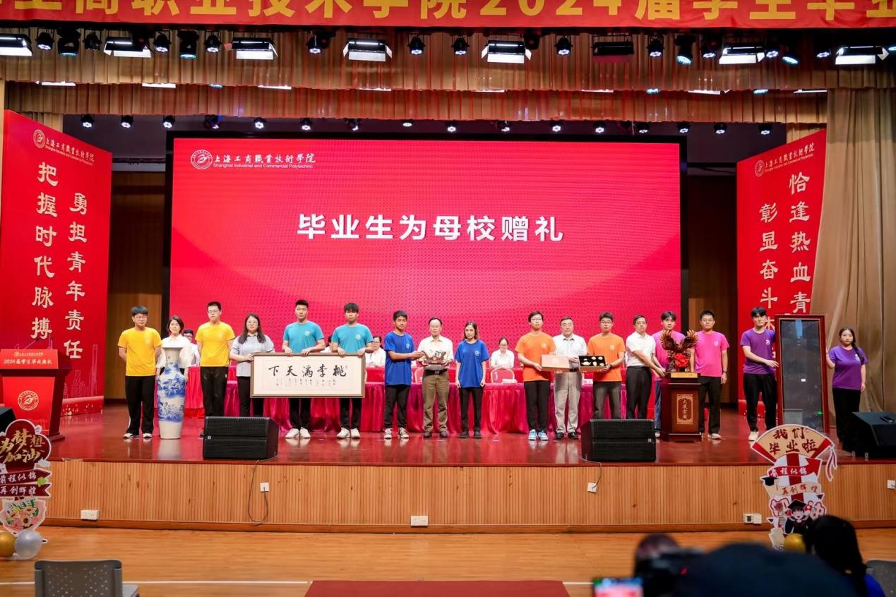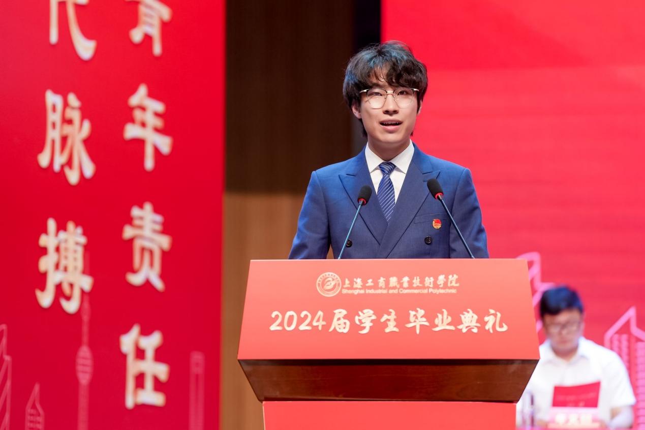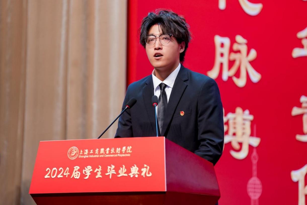 王中强向即将毕业的同学表达了真挚的祝福和殷切的希望。三年里寒来暑往,同学们匠心筑梦,为学校增添了独家记忆。同学们与工商的缘分始于一张录取通知书,成于一份毕业证书,书轻意重,纸短情长,其间辉映着工商薪火与同学们化茧成蝶的互动交融,承载着同学们敬业乐群、敢为人先的蜕变历程。同学们从刚进校时的懵懂青葱成长为独当一面的有志青年,在“挑战杯”、“汇创青春”、大学生数学建模大赛以及各项技能大赛的领奖台上大放异彩,用国家奖学金、上海市奖学金等奖项一次次刷新荣誉榜单,同学们心怀家国情怀,扎根基层一线,服务乡村振兴,把青春挥洒在祖国最需要的地方。用实际行动诠释了责任与使命,用青春汗水书写了无悔与担当。