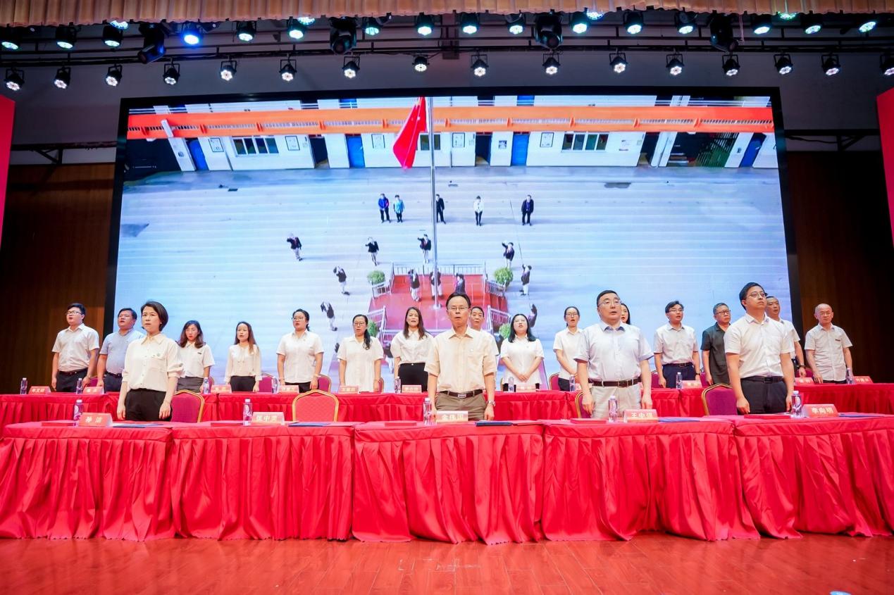 在热烈的掌声中迎接国旗、校旗和院旗昂扬入场。