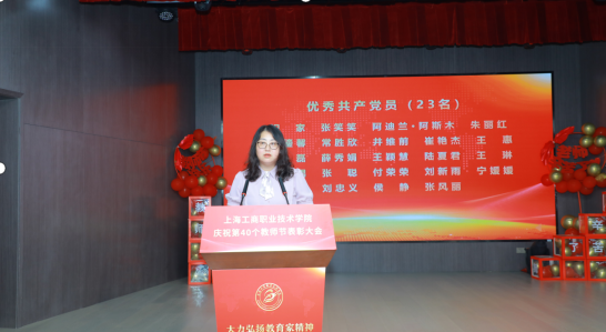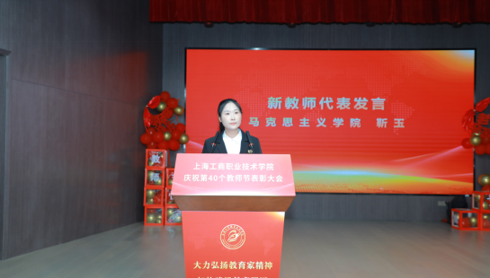 马克思主义学院靳玉代表新教师发言,她表示能成为这个大家庭的一员倍感荣幸与骄傲,在未来的日子里,将以卓越之志为引领,以教育家精神为指引,投身到教育事业中去,不断提升自己的专业素养和教学能力。将秉承教书育人初心,传播知识,传承文明,为学校的发展贡献自己的力量。