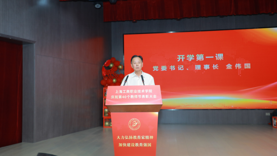 金伟国以“大力弘扬教育家精神,迈出教育强国建设的铿锵步伐”为题上了开学第一课。首先,金伟国代表学校向一直以来在教学、科研一线辛勤耕耘、躬身育人的广大教师,向在机关和后勤服务岗位上默默奉献的教职员工致以节日的问候!向刚刚受到表彰的优秀教师和教育工作者以及在校工作20年的资深教师表示热烈的祝贺!向全体新入职的教职工表示诚挚的欢迎!