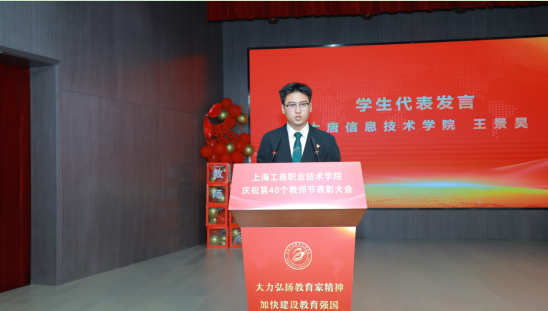 大唐信息技术学院计网234班、第十届校学生会执行主席王景昊代表全体学生发言。表达了对学校老师谆谆教导的感激和祝福之情。他说,作为新时代的青年学生,定会肯学肯干肯钻研,练就一身真本领,努力学习,不负韶华,切实担当起民族复兴大任的新使命,早日成长为“民族复兴之大器”的社会栋梁!东西南北春常在,唯有师恩留心间。