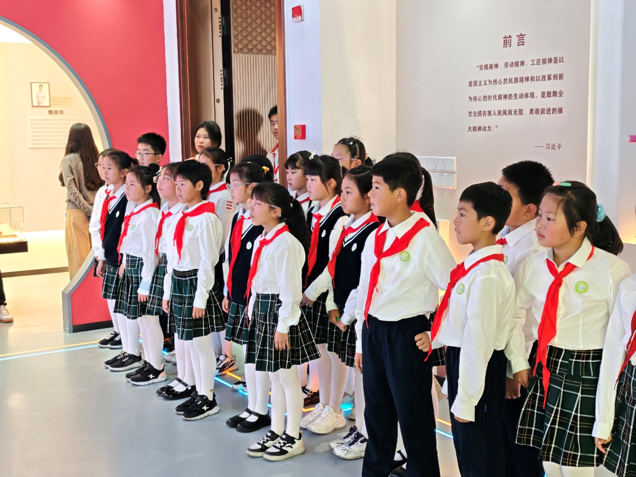 在劳模工匠风采展示馆,由大学生讲解员担任主讲,小学生们依次参观绪厅、劳模厅、工匠厅三大展厅。