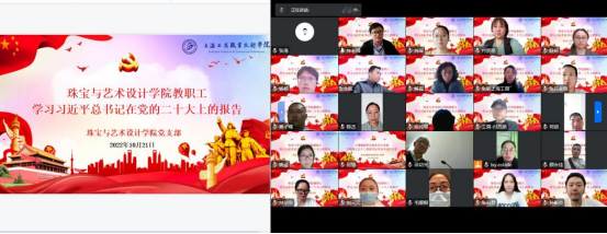 新思想引领新时代,新使命开启新征程。为进一步引导全院教职工深入学习习近平总书记在党的二十大开幕会上的报告精神,努力用报告精神武装头脑、指导实践,10月21日下午1点,珠宝与艺术设计学院党支部通过腾讯会议的方式,组织全院教职工学习习近平总书记在党的二十大上的报告。