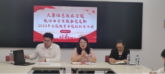 为深入学习贯彻习近平新时代中国特色社会主义思想主题教育,增强组织凝聚力和战斗力,2023年9月14日,大唐信息技术学院教师学生联合支部召开以“深入查摆找差距,凝心聚力促提升”为主题的2023年主题教育专题组织生活会。会议由党支部书记陆夏君主持。校党委副书记、副校长、纪委书记、工会主席张中美、大唐信息技术学院党总支书记王丽茹以普通党员身份出席会议。